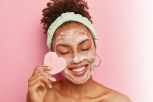 positive-dark-skinned-woman-with-afro-combed-hair-wears-headband-cares-about-facial-skin-wipes-cheek-with-cosmetic-sponge-keeps-eyes-shut-with-pleasure-copy
